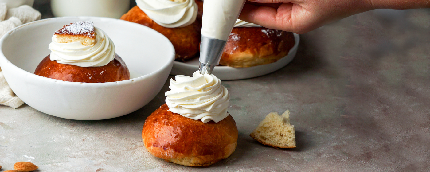 We will show you how to make the marzipan filling, whipped cream topping and the traditional way of assembling the semlor bun. Using a particular technique of melting the butter and milk before forming your dough, this method is a fantastic alternative to the traditional brioche. Alongside our expert baker you’ll further your knowledge of enriched doughs and create six delicious marzipan and cream filled buns.